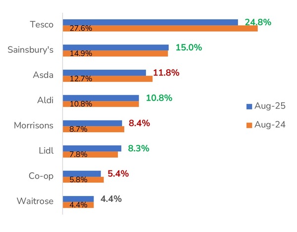 UK Grocery Market Share (12 weeks to 10 August) | Note: green denotes share gain, red denotes share loss.