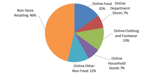 Online accounted for xx% of all retail sales, marginally higher than the xx% share a year ago.
