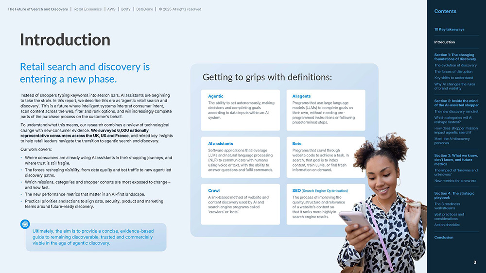 Instead of shoppers typing keywords into search bars, AI assistants are beginning to take the strain. In this report, we describe this era as ‘agentic retail search and discovery’. This is a future where intelligent systems interpret consumer intent, scan content across the web, filter and rank options, and increasingly complete parts of the purchase process on the customer’s behalf.