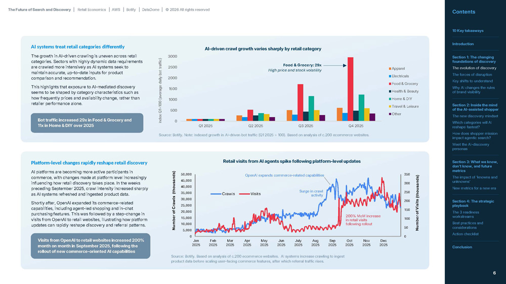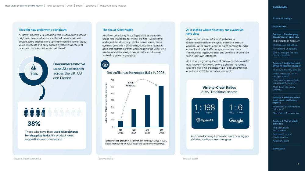 AI-driven bot activity is scaling rapidly as platforms scape retail websites for model training, live retrieval and agent-led discovery. Unlike human users, these systems generate high-volume, concurrent requests, accelerating traffic growth and changing the underlying mechanics of discovery in ways that are not always visible in traditional analytics.