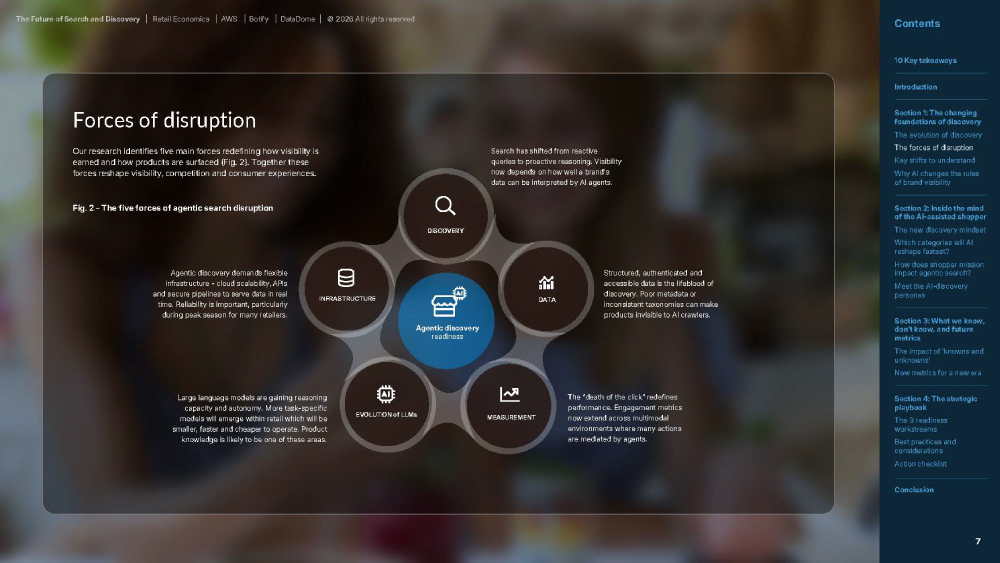 Our research identifies five main forces redefining how visibility is earned and how products are surfaced (Fig. 2). Together these forces reshape visibility, competition and consumer experiences.