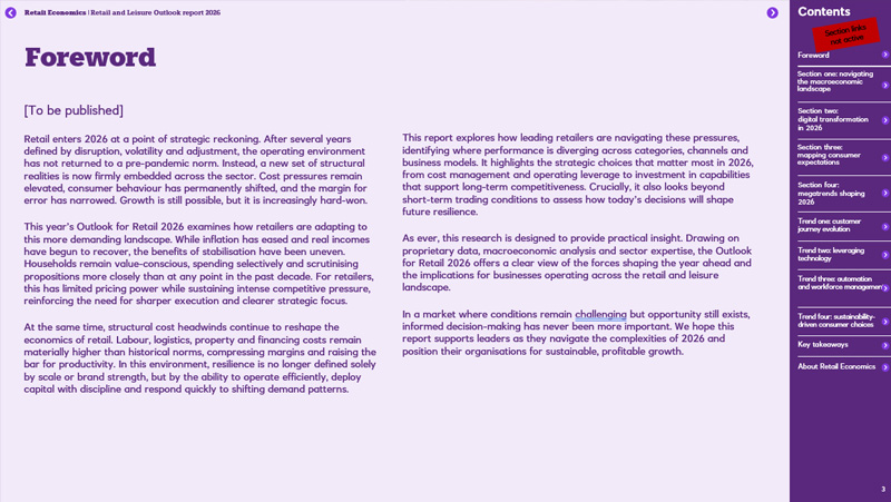 The content presented here is indicative only. It is designed to frame the agenda and signal the areas of focus explored in the final report, rather than present final data, statistics or research findings. The completed report will combine proprietary Retail Economics analysis with market data and executive insight to provide a robust view of the outlook for UK retail and leisure in 2026.