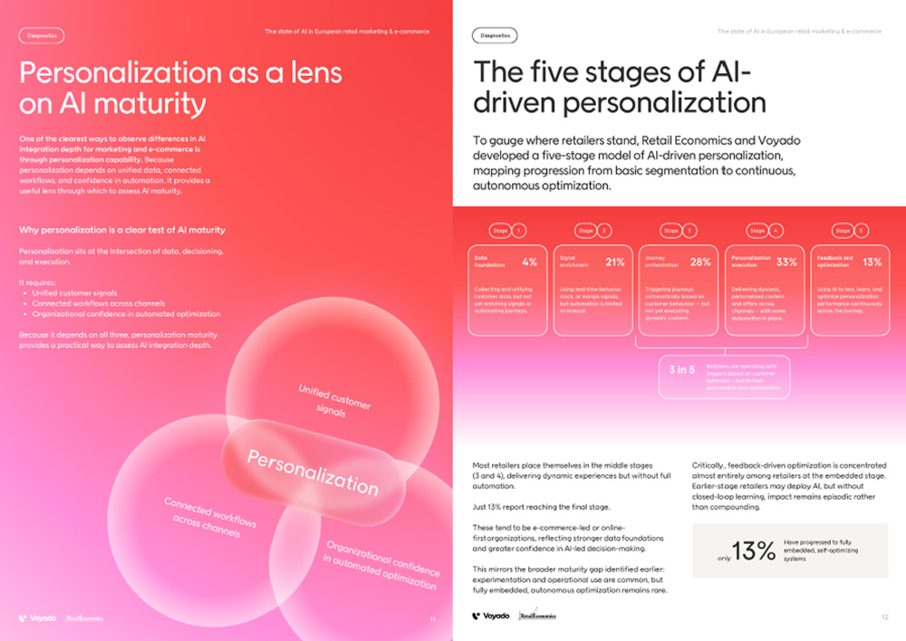 The five-stage maturity model highlights a clear progression: from basic data collection to signal enrichment, journey orchestration, dynamic execution and ultimately continuous optimisation. While many retailers are advancing into orchestration and execution, relatively few have reached the stage where AI is autonomously optimising performance in real time.