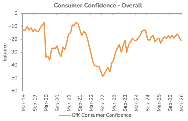 Consumer confidence declined during February, as households responded to increased uncertainty around inflation and the broader economic outlook. This weighed on discretionary spending, particularly in categories such as clothing and footwear.