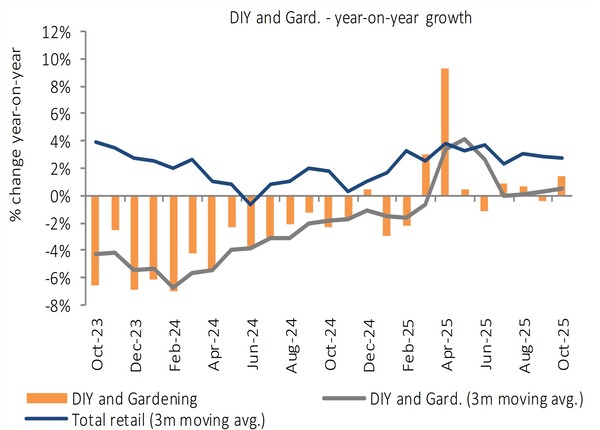 DIY and gardening sales rose by xx% year-on-year in October, reversing the decline seen in September and outpacing the xx% growth recorded in the same month last year.
